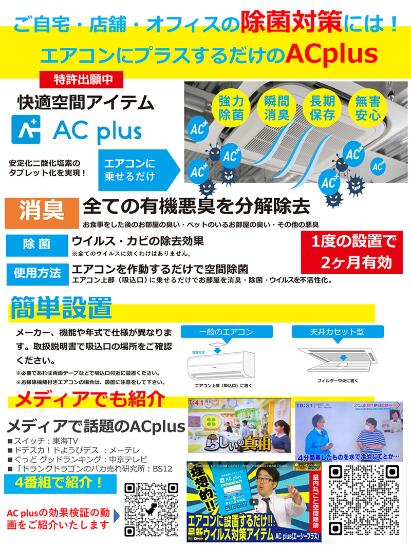 ご自宅・店舗・オフィスの除菌・消臭対策に使用できる空間除菌システム「AC plus」、